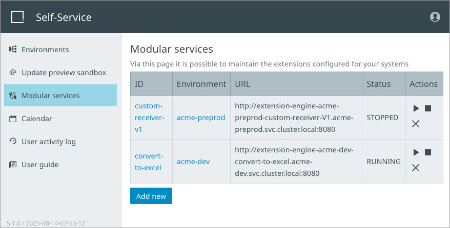 In the SSUI, the 'Modular Services' page allows developers to configure, manage, and monitor plugin execution. All extension services are displayed, along with the status and the available actions (start, stop, and delete). Developers can also add a new service and check associated logs.