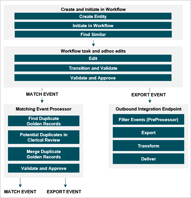Whenever entity records are approved, an export event is triggered. This allows the mastered data to be synchronized with various downstream systems.