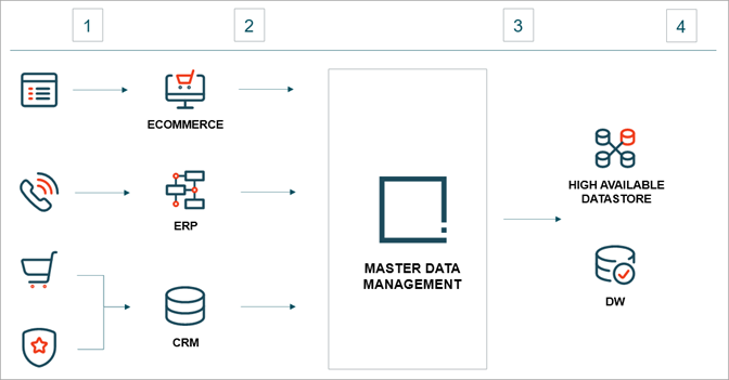 After the data is captured, it is saved to various source systems, which are the systems that store data to be delivered to the MDM solution. In this use case, the source systems are the CRM, ERP, and E-commerce platforms (column 2 in the image). Once data is within the MDM application, it is standardized, matched with existing records, and then golden records are created / maintained. Data is then stored in a data store / data warehouse.