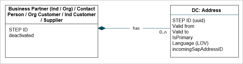 Since STEP takes a different approach to making general capabilities around this data available in relation to different business objects, it is not necessary to model the data as a separate object type to enable reuse. Instead, addresses, emails, and phone numbers are modeled as data containers on the BP object.