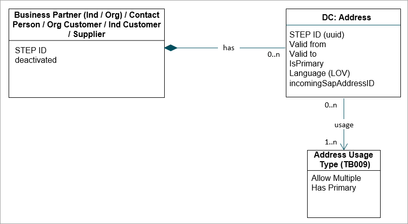 In STEP, this is simplified, so that each address may have a validity period, but the usages of the address inherit the validity period of the address. A BP object contains Address data containers, which are referenced (ID=SAPUsage) to separate Address Usage (TB009) entities (ID=SAPBPAddressUsage).