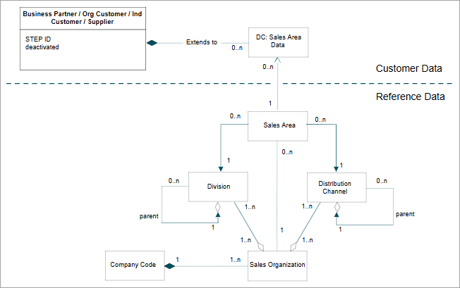 An alternate approach is to model BP extension data as separate entity objects (rather than data container objects) that live between the BP object and the BP extension object (i.e., sales area, company code, purchasing organization). These data entity objects serve the same purpose as they contain the attribution describing the relationship of the BP with each BP extension.