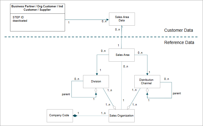 Sales Areas are referenced from the Business Partner object using a reference (ID= SAPCustomerSalesAreaDataSalesArea) from the Sales Area data entity (ID= SAPCustomerSalesAreaData).
