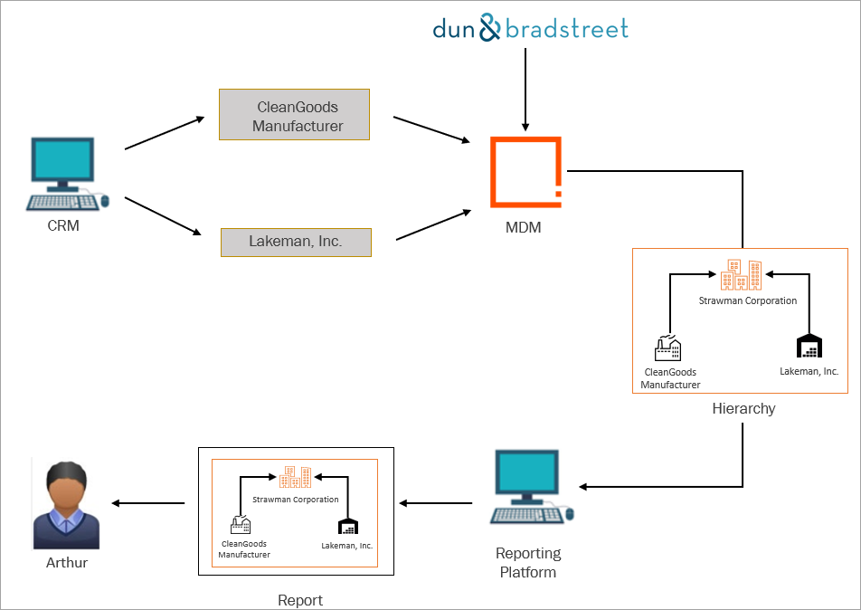 In the example above, CleanGoods Manufacturer and Lakeman, Inc. are existing ACME suppliers. However, the sales team was not aware both suppliers belong to the same parent company, Strawman Corporation. Armed with this information, the procurement team can negotiate reduced bulk costs for raw materials and goods that ACME require. Furthermore, ACME can aggregate CleanGoods, Lakeman, and Strawman into a single account grouping and better manage future agreements.