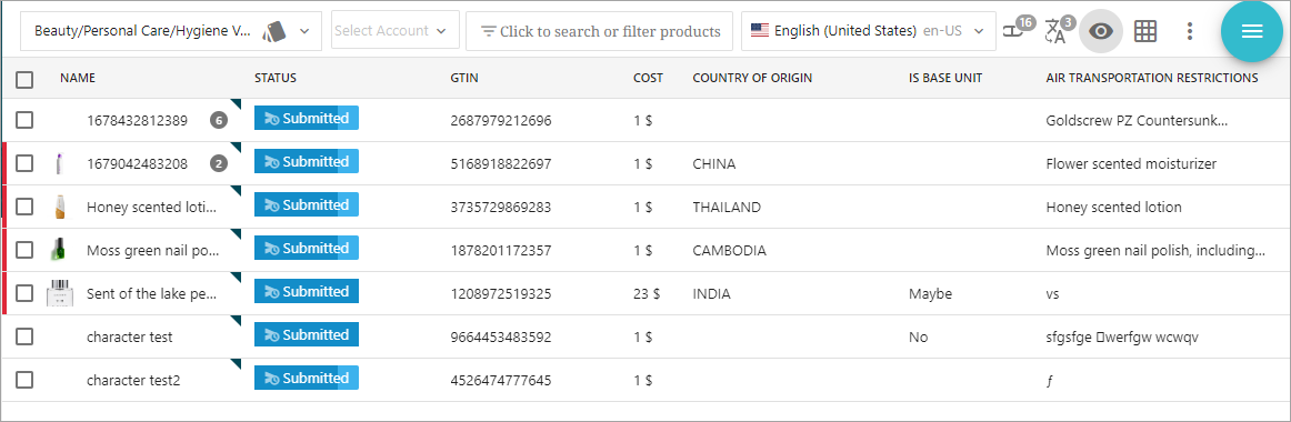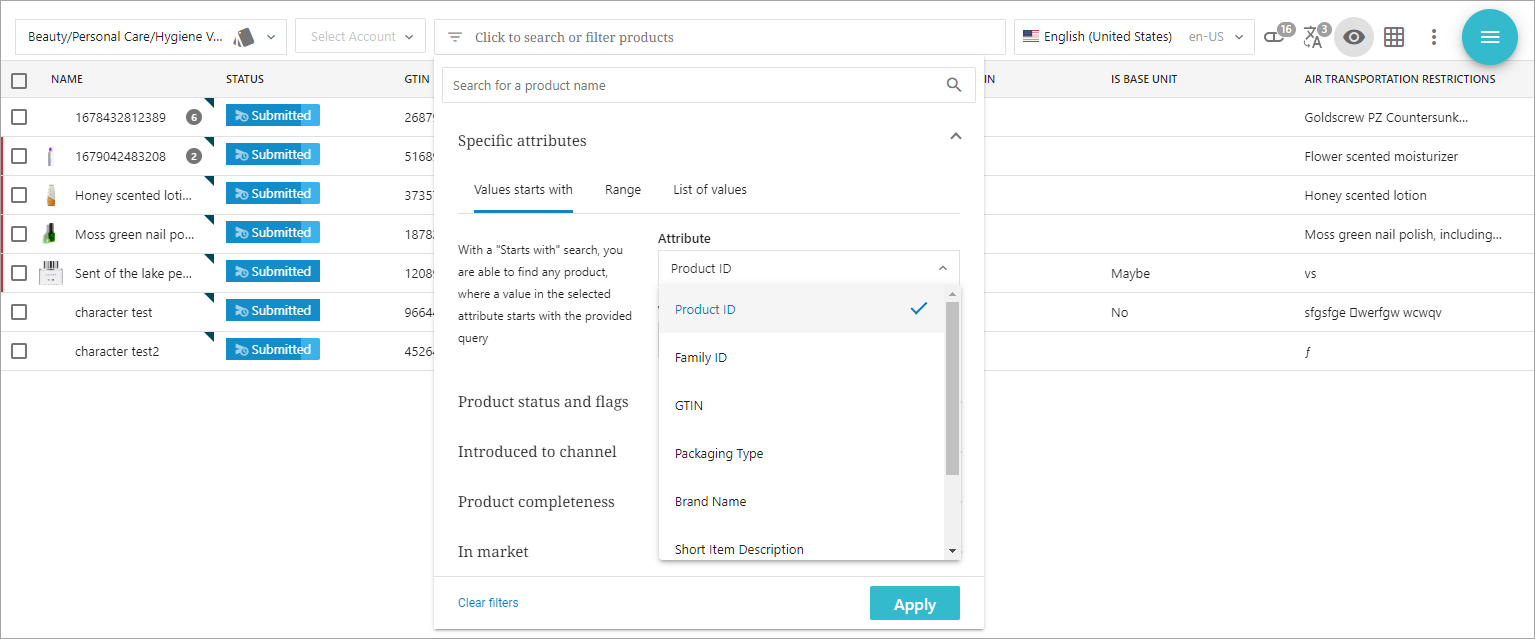 Searchable: This parameter can be configured with an attribute group containing attributes that should be searchable in PDX. Users of PDX can apply filters to search a channel for products based on specific criteria. Filtering is available in both the 'All Products' view and the 'Category' view. Users can search for a product name or use one of the provided filters to search: 'Specific attributes', 'Product status and flags', or 'Introduced to channel.'