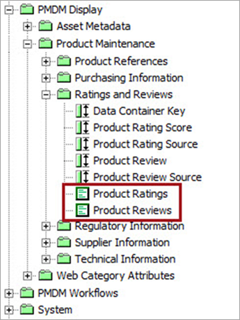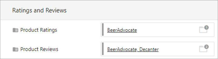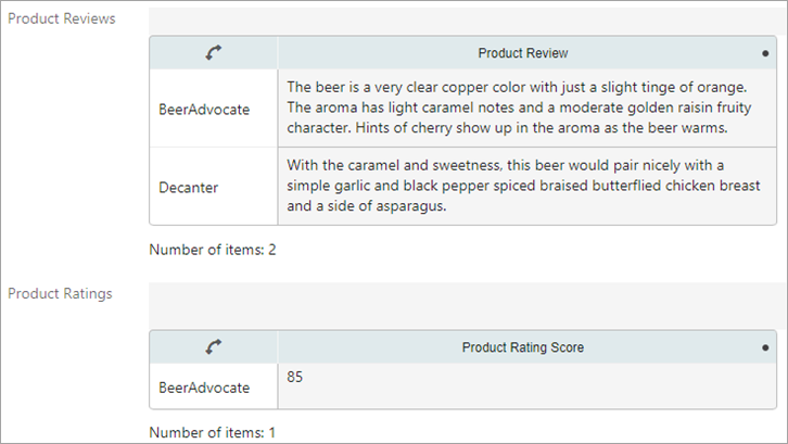 To illustrate the different ways data containers and composites display in their respective systems (STEP and PDX), this section will outline, via screenshots, how two sample data containers, 'Product Ratings' and 'Product Reviews,' will display. In the screenshot below are the two sample data containers.