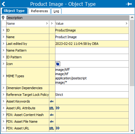 MIME type – By applying a MIME type limitation, retailers can restrict submitted assets to only those with the desired MIME types. For instance, if a retailer wants all instruction manuals associated with the submitted product to be of the .pdf MIME type, the validation applied in the configured product data validation would be ‘application/pdf'. This validation is applied directly on the object type, found under ‘Object Types & Structures' on the ‘System Setup' tab in the workbench. In the example shown in the screenshot below, the object type is 'ProductImage'. In this case, the admin has determined that if images submitted for products are not of the MIME types listed in the 'MIME Types' field, the product cannot be submitted. If possible, PDX will automatically convert the file to one of the valid file formats.
