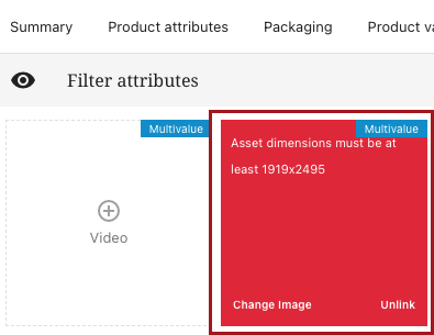 If an asset does not satisfy one of these configured rules, the corresponding product cannot be submitted and the asset will be marked with a red error, as shown in the screenshot below: