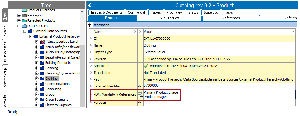As an example, a retailer has chosen the 'PDX: Mandatory References' attribute as the Category Mandatory References Attribute. In addition, the retailer has decided that both 'Primary Product Image' and 'Product Images' asset references should be mandatory for suppliers in PDX in the 'Clothing' category. To implement this, the retailer has added both references to the 'PDX: Mandatory References' attribute on the 'Clothing' product category node, as depicted in the screenshot below.