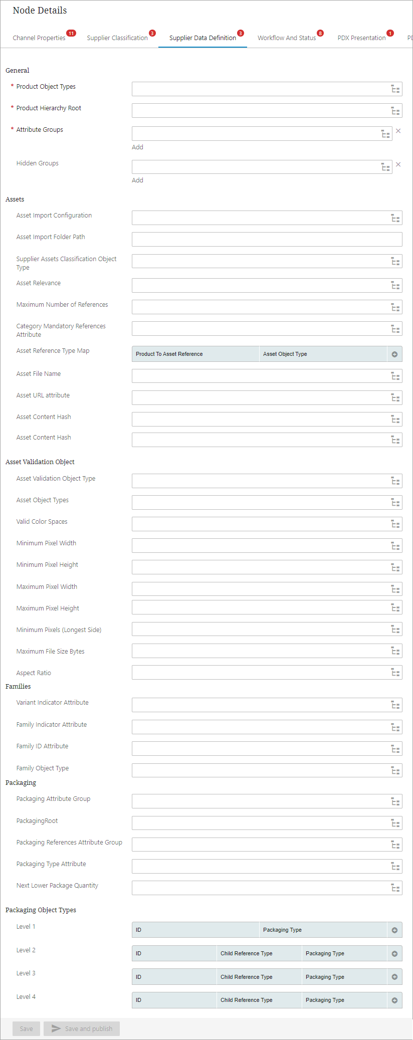 The Supplier Data Definition tab within the PDX Onboarding Channel Configurator offers multiple parameters that define data properties provided by suppliers through PDX. These properties relate to products, packaging products, and assets.