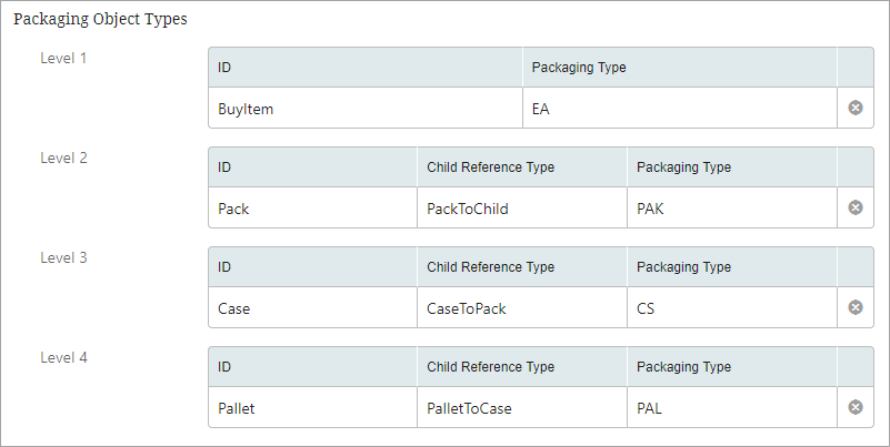 The parameters available within this canvas are relevant to the setup of the packaging hierarchy. This parameter contains up to 4 entries, one for each relevant packaging level. For each packaging level the following must be configured: