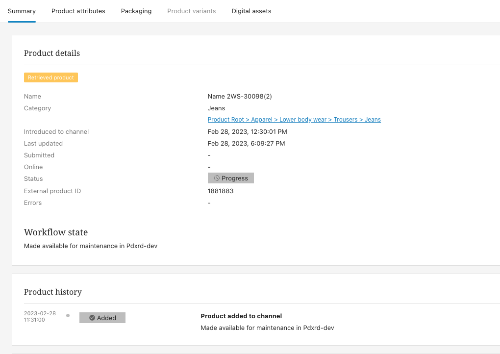 A product that enters PDX in this way will be marked as a ‘retrieved product’ and will enter the PDX onboarding process in the workflow state named, 'Made available for maintenance in <name of channel>’, as shown in the screenshot below.