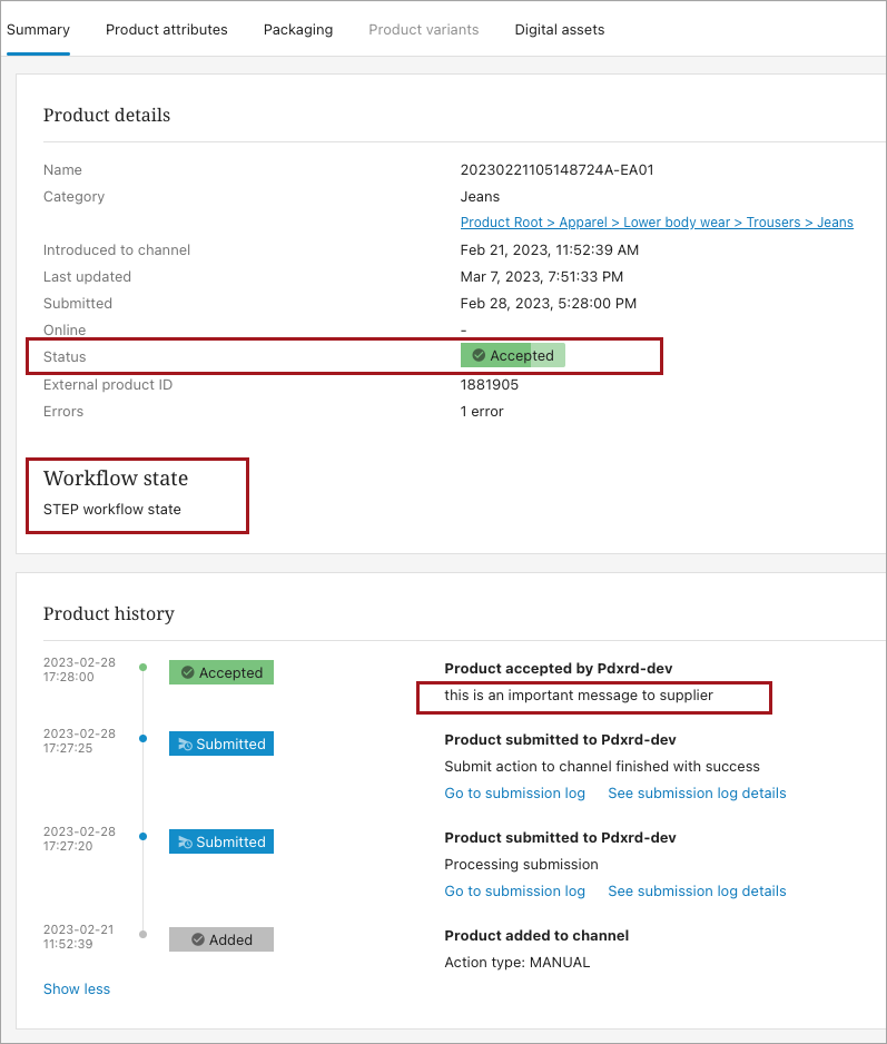 The Supplier Message Attribute attribute value: This attribute contains product onboarding-relevant information from the retailer. For example, the reason a retailer has returned the product for rework. The value given to this attribute will be added as a new entry in the product’s ‘Product history’ in PDX.