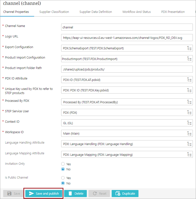 Typically, the initial testing will take place on https://pdx-preprod.stibosystems.com/ and the production version of the channel will be installed on https://pdx.stibosystems.com/