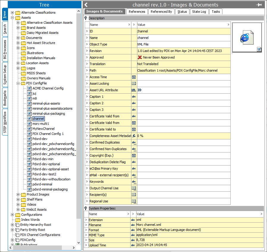 The Data Standard update is implemented by the PDX team. Besides exporting the channel configuration, the update process will also export a PDX Channel Schema from STEP using the export configuration defined within the Channel Properties tab. This export, generated from the ‘Approved’ workspace in STEP, then converts the PDX Channel Schema and the Channel Configuration into the channel-specific Data Standard in PDX, so that changes made to the product hierarchy, relevant attributes, etc., are properly reflected in PDX.