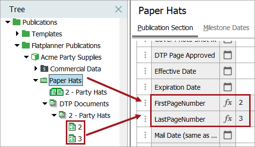 Use the formulas sectionFirstPageNumber() and sectionLastPageNumber()to return the values of the first and last page numbers of the DTP pages saved within a section. Typically there will be more than two pages, but for this basic example, only two DTP pages have been saved into the Paper Hats section.