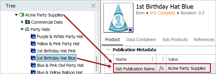 The examples in this topic show how calculated values from publishing functions display on product objects in the STEP Workbench Tree. To choose a version for testing purposes, go to View > Select version in the menu bar, then choose the relevant publication version.