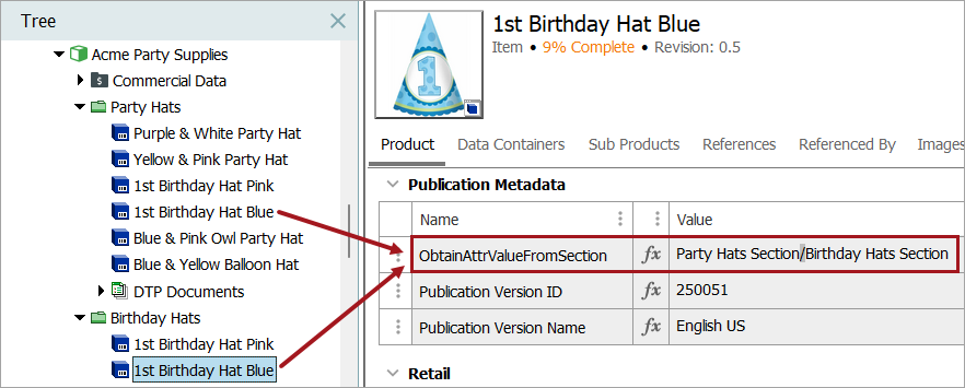 With the product selected in the Tree, the value of Section Theme (SectionTheme) from both sections displays in the ObtainAttrValueFromSection calculated attribute field. Values are sorted as they appear from top to bottom in the publication hierarchy, and are separated with a slash (/).