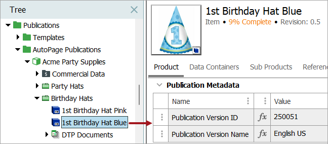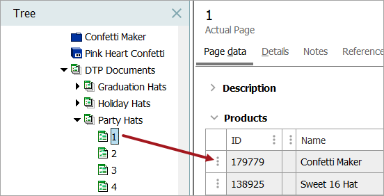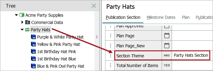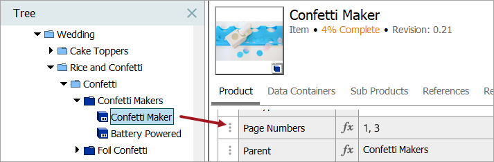 When the Confetti Maker product is selected in the Tree, the page numbers on which it appears display in the calculated attribute field, e.g., pages 1 and 3.