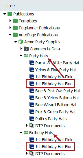 The selected product is linked into two sections of the publication—'Party Hats' and 'Birthday Hats.'