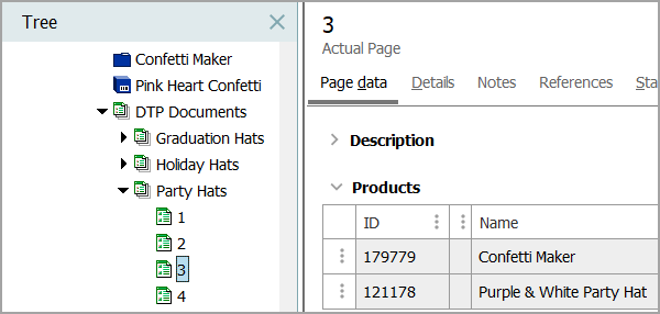 The below screenshot shows the Page data tab of two selected DTP pages. The products that appear on the pages are listed under the Products section. This example uses a product named 'Confetti Maker,' which appears on both page 1 and 3 of the publication.