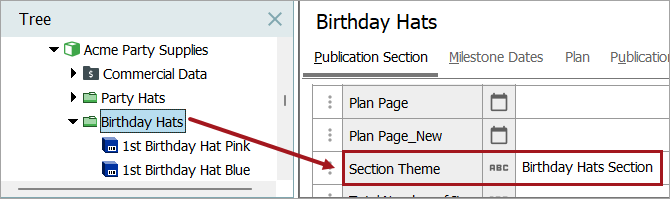 On 'Birthday Hats,' the value of Section Theme (SectionTheme) is 'Birthday Hats Section.'