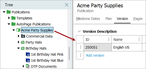 The following image shows the ID (250051) and Name (English US) of the selected publication on the Version tab.