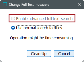 Disabled - If the 'Full text indexable' parameter is set to No, double-click the field to display the Change Full Text Indexable dialog. If the 'Enable advanced full text search' option is disabled in the dialog, the index is disabled for your system.