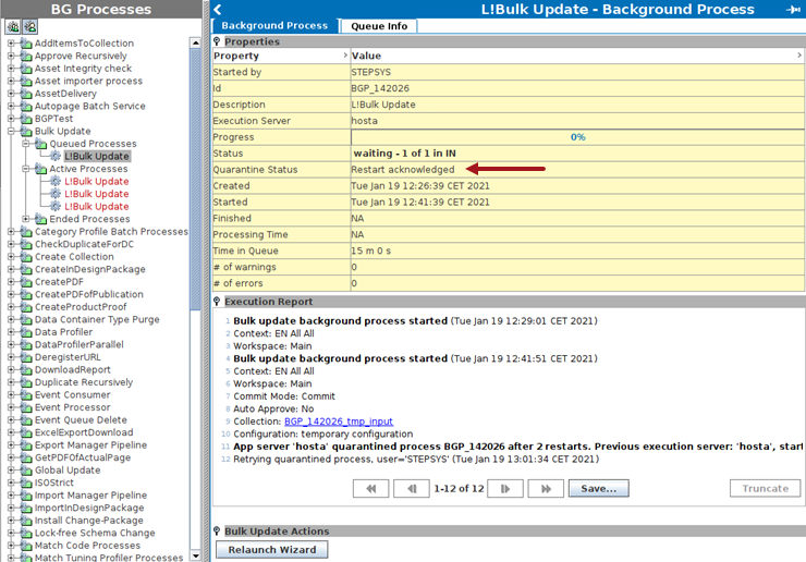 Sometimes, an application server / node crash is not caused by the specific background process that was quarantined. If the issue can be found and fixed, the quarantined background process can be restarted from the workbench. Alternatively, if you determine that the quarantined background process should not be started again, it can be deleted.