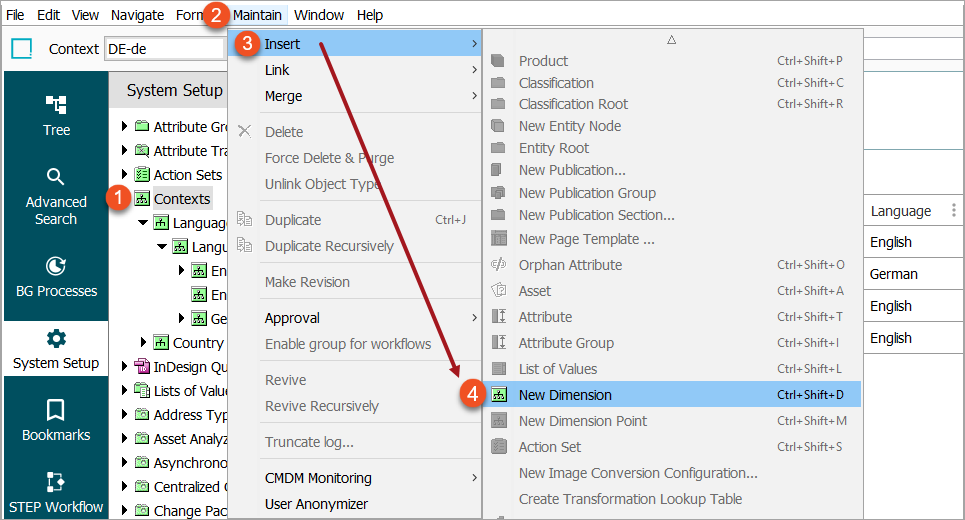 1. On the System Setup tab, navigate to the Contexts node and select Language.