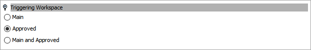 This section is displayed in rare cases, specifically, only if either the 'Main' or the 'Main and Approved' option was previously selected in a release where the option was available. Not all EPs allow triggering from the Main workspace due to limited use case requirements and the impact to performance. However, for some EPs, it is necessary. For information about triggering from Main for a specific EP, refer to the appropriate topic in the Configure Event Triggering Definitions section below.