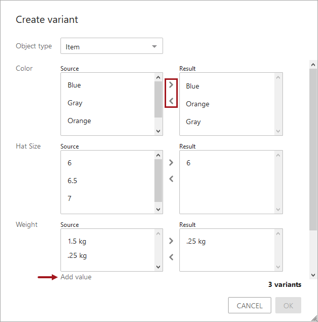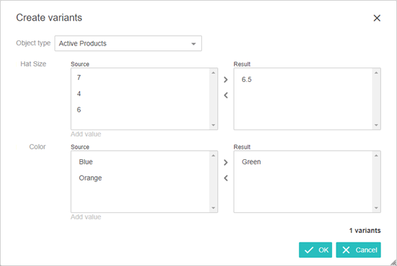 If added as an Action during configuration, click the 'Create variants' button to display the 'Create variants' dialog. Variant attributes are displayed and values can be added for the selected object type. If the new values match an existing variant, the potential duplicates are shown above the Cancel button. In the following example, one other variant already exists with the selected 'Hat Size' and 'Color' combination selected.