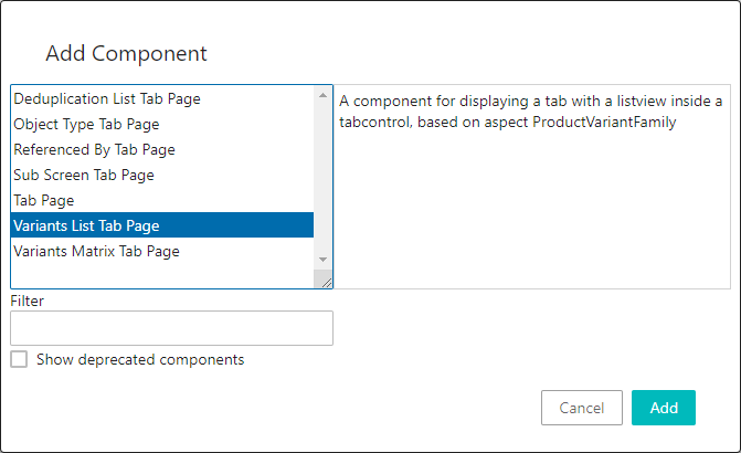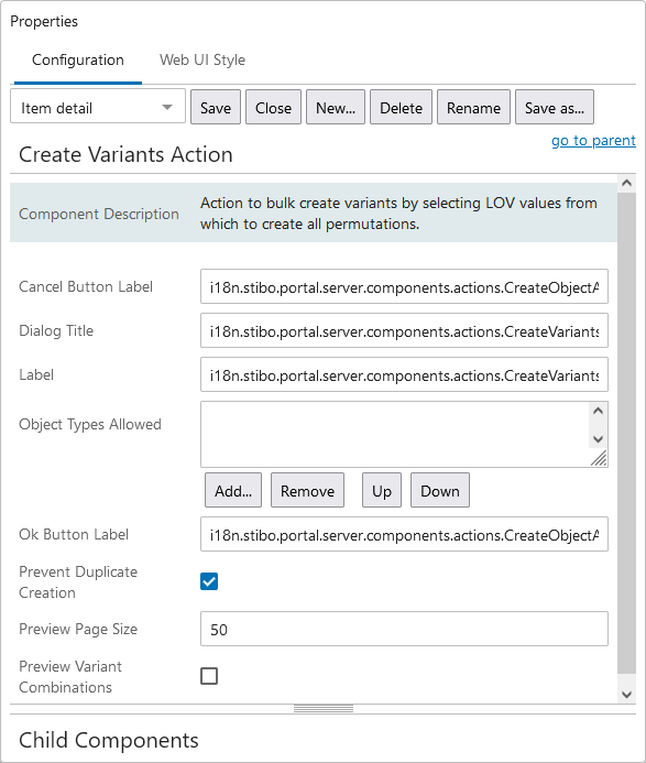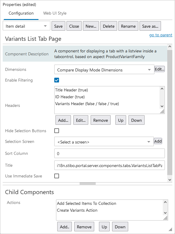 - In Web UI, product variants can be displayed using the Variants List Tab Page. You can insert it into a Tab Control on a Node Details screen using the Child Components 'Main' parameter. For more information, refer to the Design Mode Basics topic and the Node Details Screen topic in the Web User Interfaces documentation.