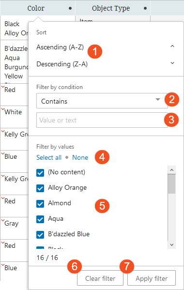 Referencing the numbered elements in the above screenshot to the corresponding numbers in the list below, functionality in the filtering window enables users to: