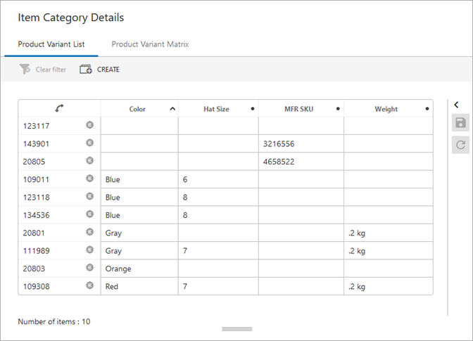 The List view is an overview of all variant products and the variant attribute values. This view also allows you to create and delete variants and modify variant values.