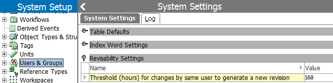 By default, the system creates a revision on an object if a user makes a change to the object and the time from when the object was first touched after the last revision was made is greater than the timing threshold. This is particularly useful in cases where an object is primarily maintained by a single user and would not otherwise have a revision made without that user choosing to do so manually. The threshold functionality ensures that changes are recorded, without creating an excessive number of revisions.