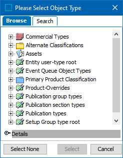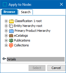 Select the allowed classification or product node for the group. This would include specific sub-nodes as well. If a specific Object type and node is selected, the Users in the Group can only access Objects within that selection. e.g., a specific Classification or Product node, or Products of a certain Object type. However, if a Product not included in the selection is linked to a Classification node to which the User has access, the User can access the Product, but not edit it.