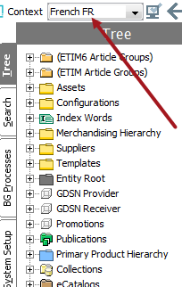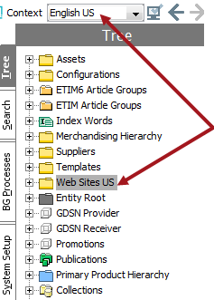 The example below shows an application where classifications have been made country-dependent, and an entire web structure has been created that is visible only in a context where English US is the selected country. The Web Sites Classification folder is not visible in the French FR context.