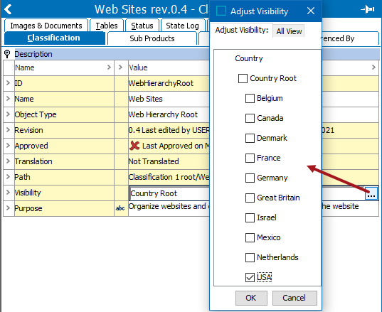 Click within the Visibility row, and then click the ellipsis button () that is available to the right of the words 'Country Root'. From the 'Adjust Visibility' dialog, select which country or countries your folder structure will show in. In this example, we have a classification structure for Web Sites US.