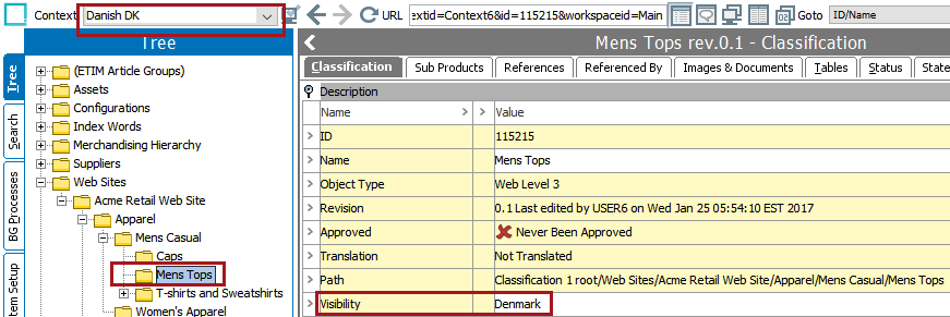 When sub-classifications are visible in another context, this can be found on the References tab of the parent. For example, the Mens Tops classification has Visibility = Denmark. In the Danish DK context, this classification is displayed in the hierarchy.