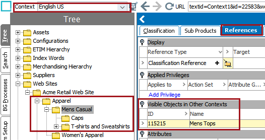 When we switch to the English US context, the Mens Tops classification is not visible in the Tree. However, if we view the References tab of the parent folder (Mens Casual), the Mens Tops classification is listed under the 'Visible Objects in Other Contexts' flipper.