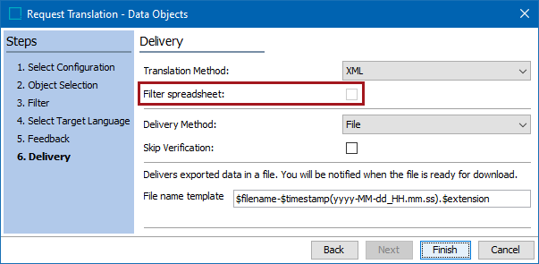 If set to Y, the 'Filter spreadsheet:' option will display on the 'Delivery' screen (step 4) of the 'Request Translation' wizard, which is used when starting a translation workflow. If checked, the exported XLS file will only include text entries that require translations.