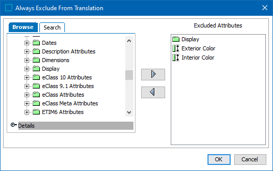 - In the 'Always Exclude From Translation' dialog, select any language-dependent attribute or attribute group and click the right directional arrow to include in the 'Excluded Attributes' column. In the example shown in the screenshot below, the user has selected the attribute group 'Display' and the attributes 'Exterior' and 'Interior.' To remove any attribute or attribute group from the 'Excluded Attributes' column, select it and click the left directional arrow.