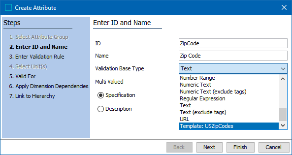 The example below shows how a new Validation Template may be created and how that new template subsequently displays in the drop-down list of validation base types when a new attribute is created (or when changing an existing attribute's validation).