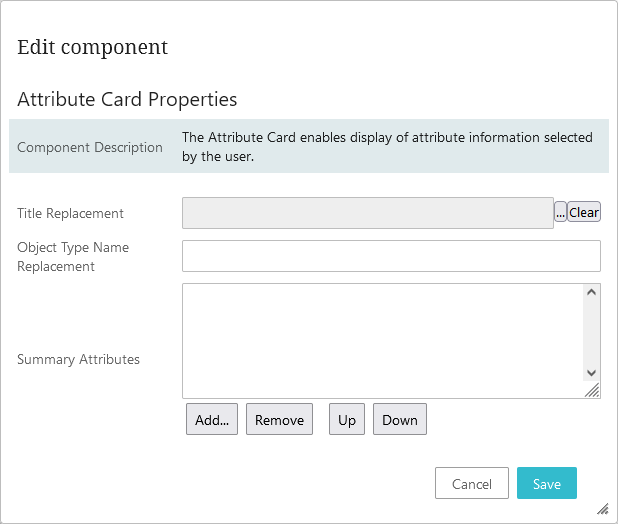 - To configure the 'Attribute Card' option, users may add values to the fields that display in the 'Attribute Card Properties' pop-up.