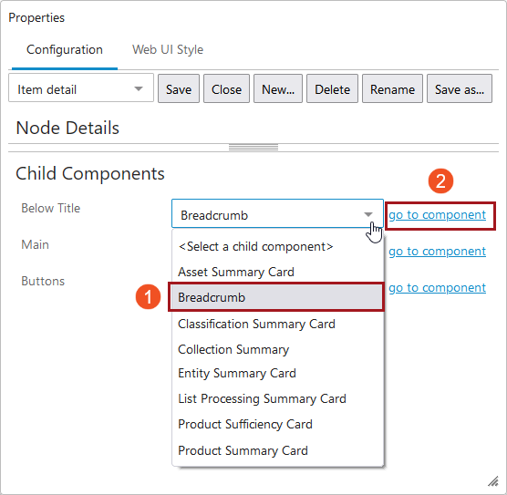 - Access the designer on the Node Details screen mapped to the relevant Asset object type. Under 'Child Components', select the 'Breadcrumb' option from the 'Below Title' dropdown. Then click 'go to component'.