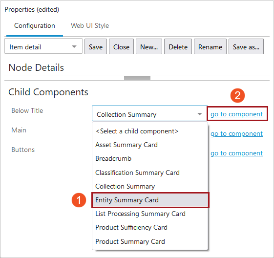 - Access the designer on the Node Details screen mapped to the relevant entity object type. Under 'Child Components', select the 'Entity Summary Card' from the 'Below Title' dropdown. Then click 'go to component'.