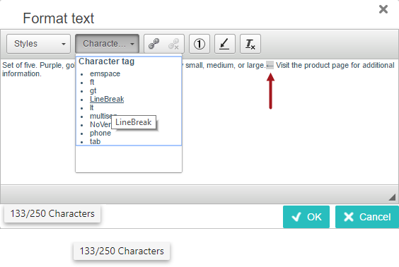To insert a character tag, place your cursor within the text exactly where you want the character tag to display. Then, click the Character tag dropdown and make a selection. Character tags appear with a gray background within the 'Format text' dialog and within the attribute value field.