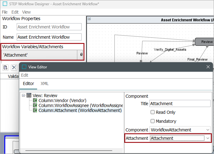 Note: The Mandatory checkbox in view configuration provides a visual indicator only—it does NOT enforce that the attribute is populated. If the attribute must be populated prior to exiting the state, the attribute must be marked as mandatory using the Mandatory Data tab of the state or transition editor. More information on this is available in the Mandatory Attributes, References, and Variables in Workflows topic.