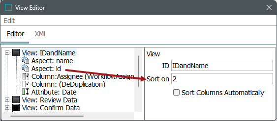 With columns sorted automatically, the Date column displays before the DeDuplication column, even though they are in the reverse order in the IDandName view.